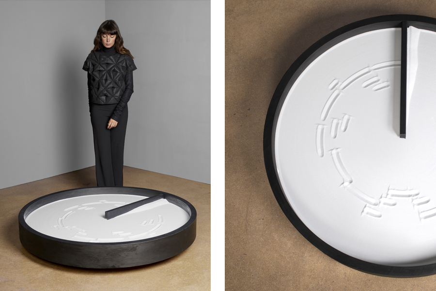 The Klavarskribo notation system, introduced by the Dutch inventor Cornelis Pot in 1931, informs the third work in this series. In this system, duration and rhythm are shown graphically and notes are written and read vertically. Klavarskribo notation, in its ability to be transcribed into MIDI files, formed the basis for the creation of an interactive digital piano keyboard trainer called Synthesia, with strokes that express the length and pitch of a tone. Siba translated this notation system into a circular ‘pattern-machine’ that lays on the ground and contains a layer of sand. A hand, similar to a clock, rotates continuously—its integrated keys etch grooves into the sand according to the main melody of the composition.