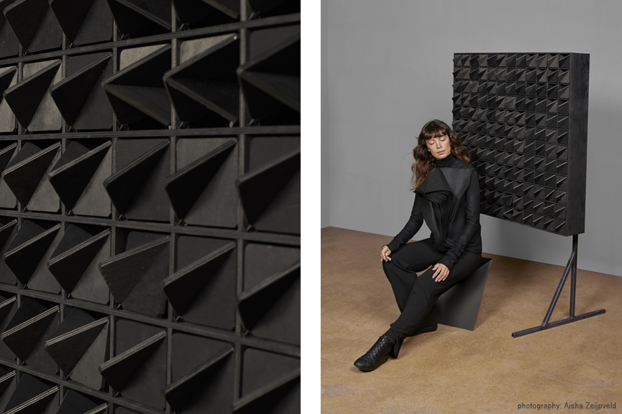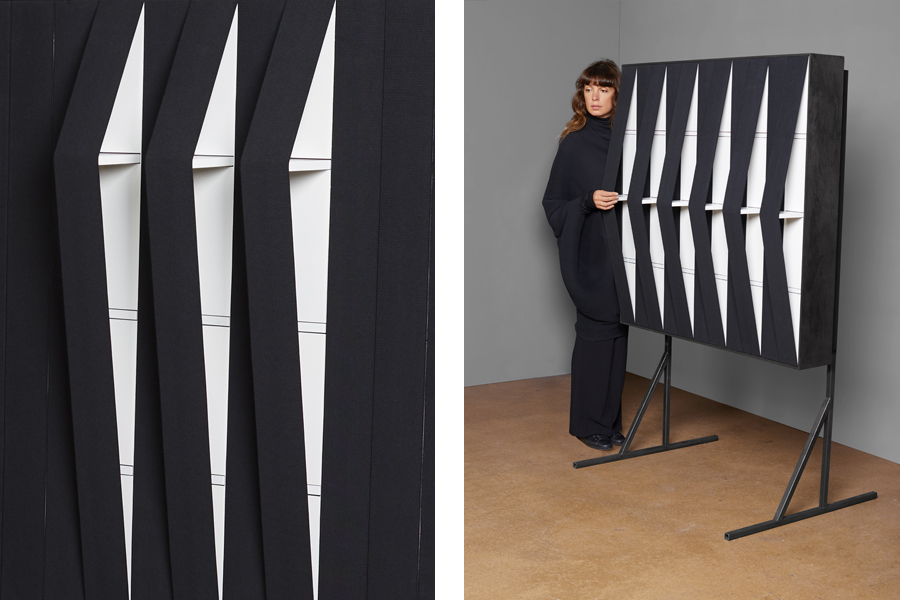 The second work is inspired by what is now considered to be the standard music stave. This system, characterised by its lines and round notes, was developed in the 11th century by Guido d’Arezzo, an Italian monk, and is based on the human voice. Siba translated this system into a ‘pattern-machine’ with 11 parallel elastic ribbons that cover 33 movable bars. The bars move forward, in relation to a specific layer within the music composition, and strain the ribbons, as if the machine was breathing.