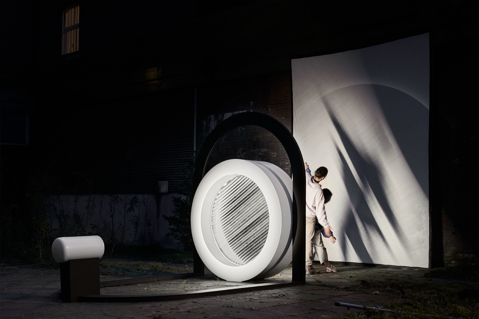 The interactive outdoor installation measures 2,6 meters in height and 2,2 meter in width. The artwork consists of an oval-shaped metal frame 3 meters in length. The frame is bent in a 90 degree angle towards the back side, where it holds a big white circle-shaped frame in an upright position. A transparent lens in the center of the white frame continually revolves around its axis at low speed. The lens is illuminated by a theatrical spotlight from the front side of the installation. The light that passes through the lens casts shadow images of the bypassing visitors on a screen positioned behind the installation.